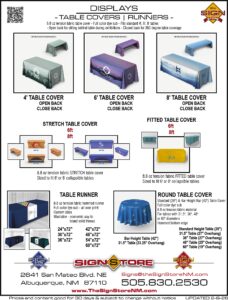 Our standard table cover is a great table topper for trade shows, exhibitions, and any presentations. Our table covers are dye sublimated and are 100% washable if they ever get dirty. This table cover is made from our 8.8 oz. polyester table fabric sized to fit 48″ x 30″ x 30″ | 72″ x 30″ x 30″ | 96″ x 30″ x 30″ display tables. The table cover is sewn with rounded corners and hang approximately 2″ above the floor. The back side of this table cover is open keeping the leg area open for sitting exhibitors.